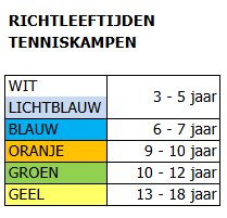 We voorzien tijdens de schoolvakanties de leukste tenniskampen. Onze spelers scherpen niet alleen, op een actieve en kwalitatieve manier, de tennisvaardigheden aan maar maken ook kennis met andere sporten en activiteiten. Het programma bestaat uit tennistrainingen in kleine groepjes afgewisseld met leuke teamactiviteiten en sporten, specifiek gekozen in functie van de sociale- en motorische ontwikkeling. Onze jongste toppertjes (wit, lichtblauw, blauw en rood) krijgen tennistrainingen afgewisseld met sport en creatieve spelen.